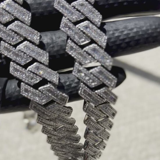 This 18mm baguette chain is a masterpiece adorned with Premium Approved (Certified lab-created CZ) stones, ensuring a dazzling display of radiance. Available in 18kt plated gold or Sterling Silver, it exudes an air of luxurious sophistication. Embrace the night with confidence as this chain is 100% waterproof, rust-resistant, fade-resistant, and scratch-resistantβa true testament to its durability and flashy elegance.